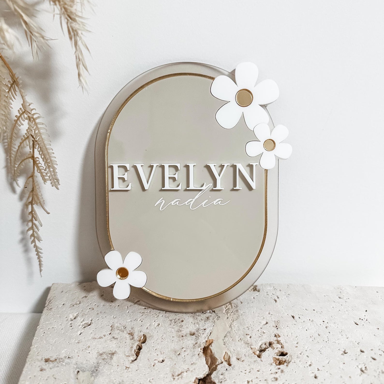 Celebrate your baby girl's arrival with our elegant acrylic birth announcement plaque – a timeless keepsake designed to mark one of life's most precious milestones. Crafted with care, this piece features a soft blush pink border, frosted nude acrylic center, and charming 3D white daisies with gold accents for a modern, feminine touch.