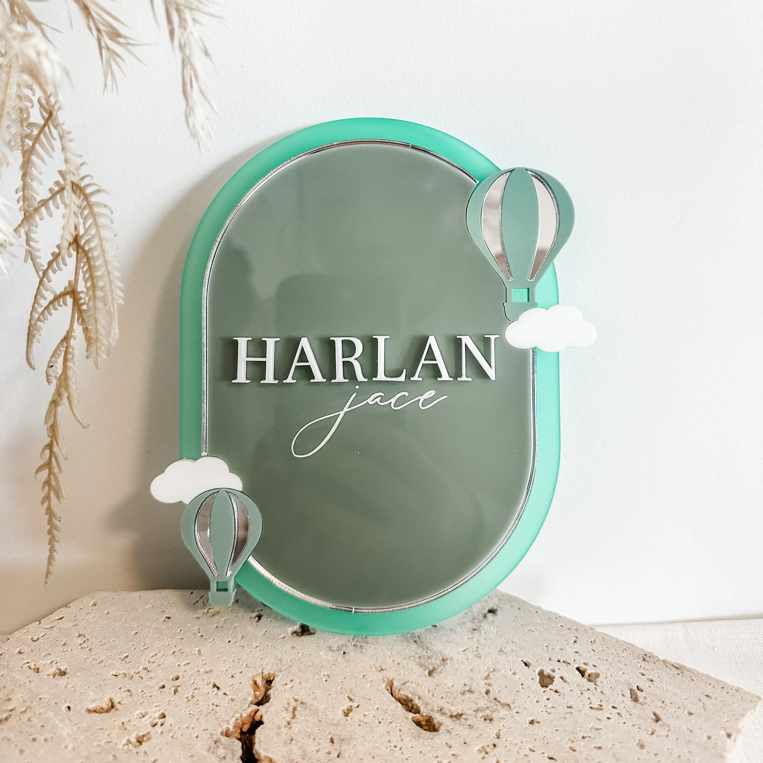 Celebrate your baby boy's arrival with our elegant acrylic birth announcement plaque – a timeless keepsake designed to mark one of life's most precious milestones. Crafted with care, this piece features a soft sky blue border, bluestone acrylic center, and charming 3D hot air balloons with silver accents for a modern, cute touch.